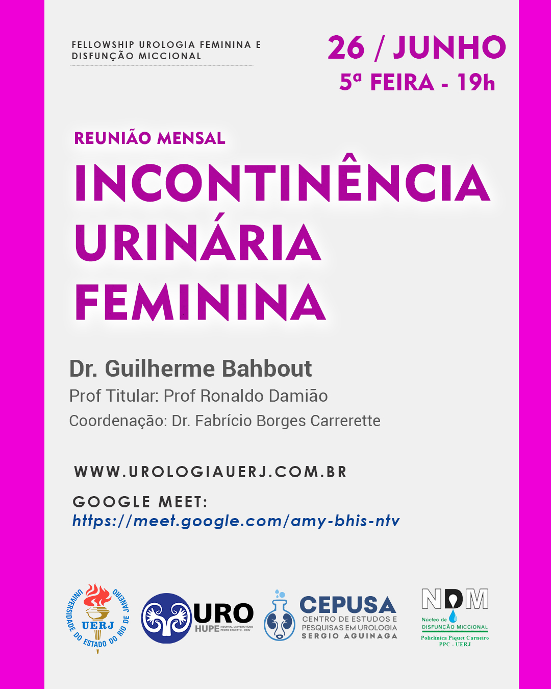 26jun – Incontinência Urinária Feminina – Fellowship Urologia Feminina e Disfunção Miccional (Reunião Mensal)
